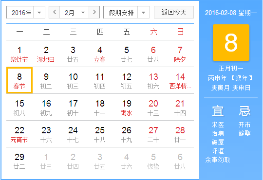 2016年春节是几月几号_2016年春节是2016年2月8日